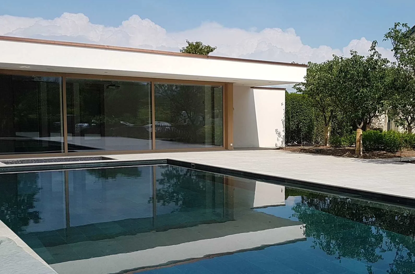 Création d'un poolhouse en structure bois de 110 m2 et aménagement paysager. Toiture et ossature bois en panneaux structurels.